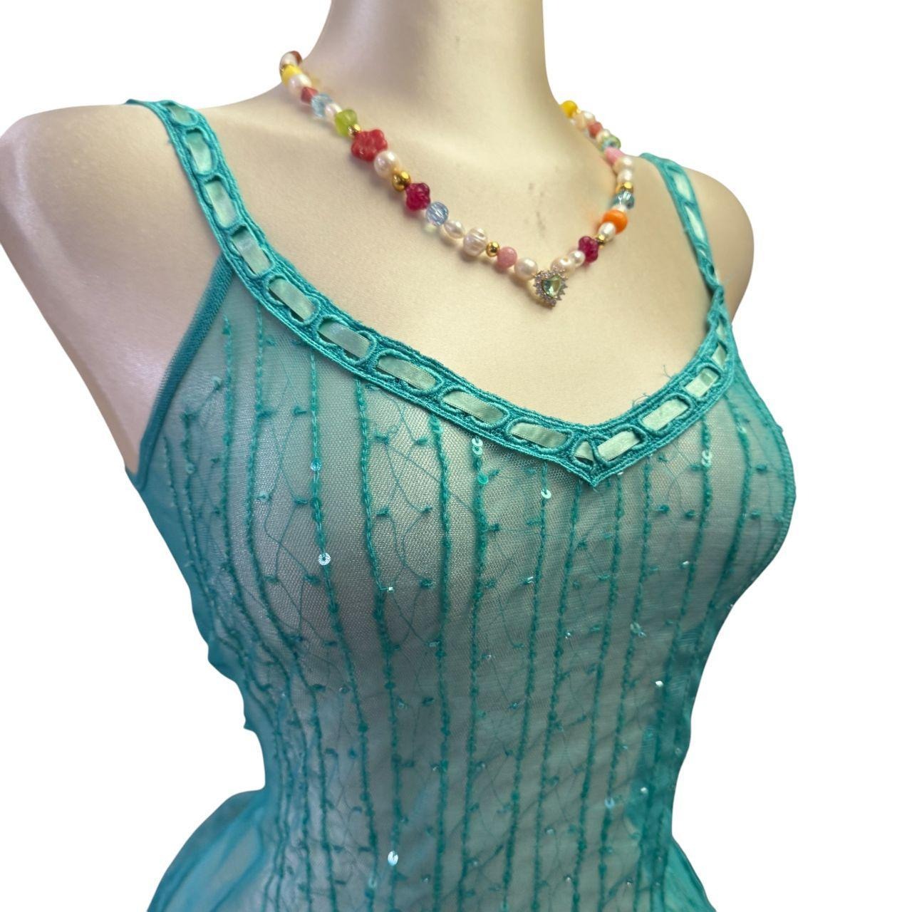 90s Vintage Aqua Blue Sequin With Ribbon Mesh Top