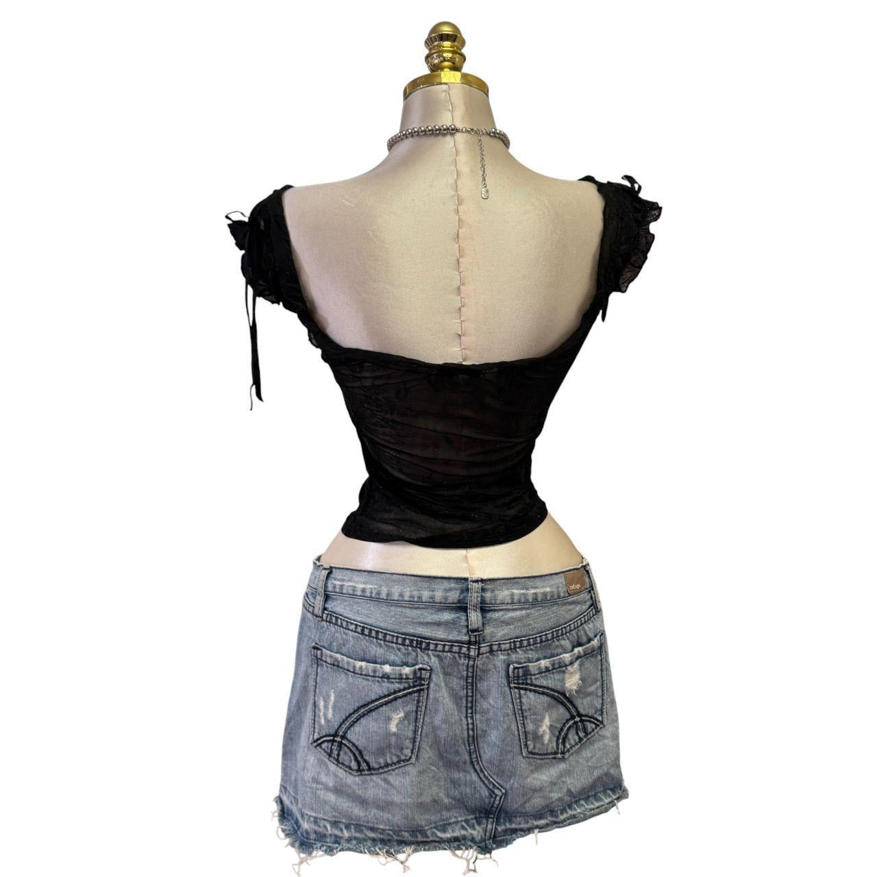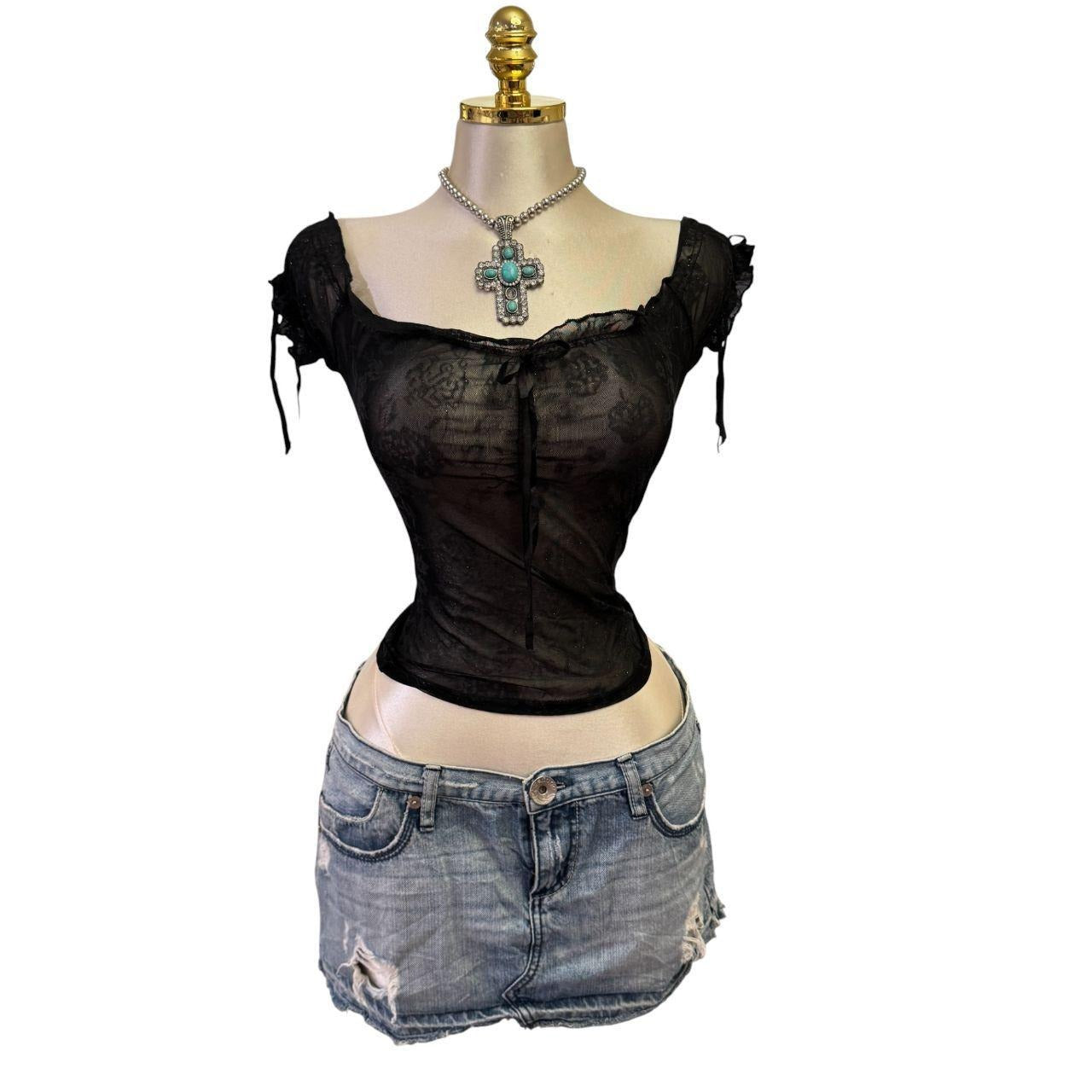 90s Vintage Black Mesh Glitter Paisley Print Top