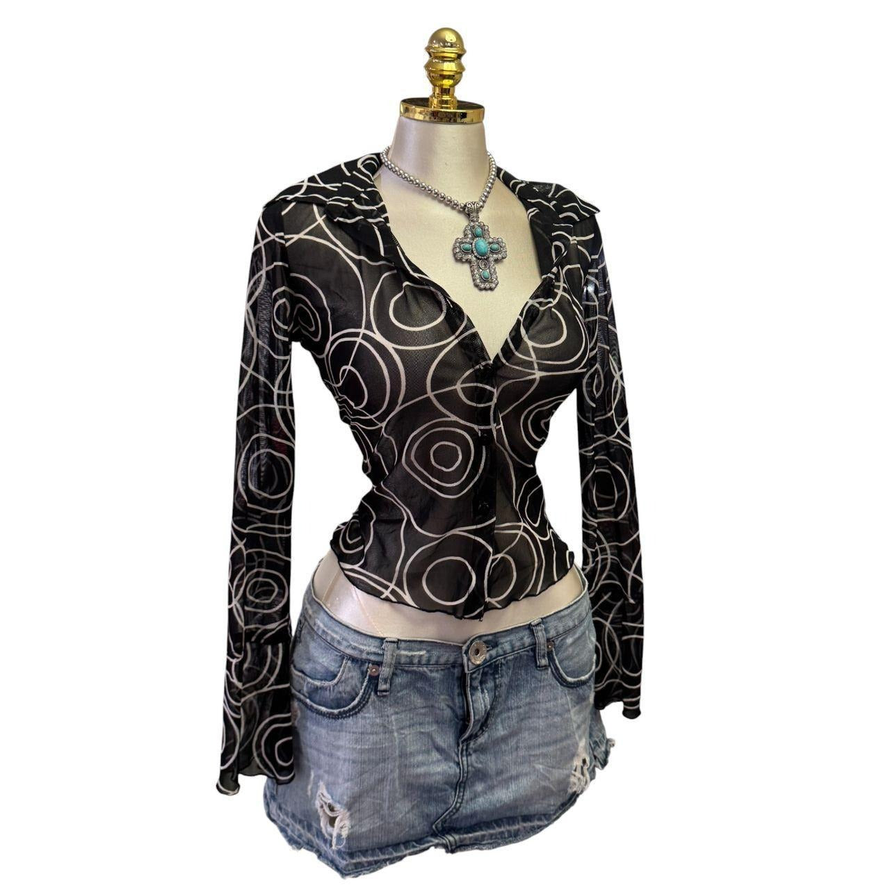 90s Vintage Black White Spiral Pattern Mesh Top [S]