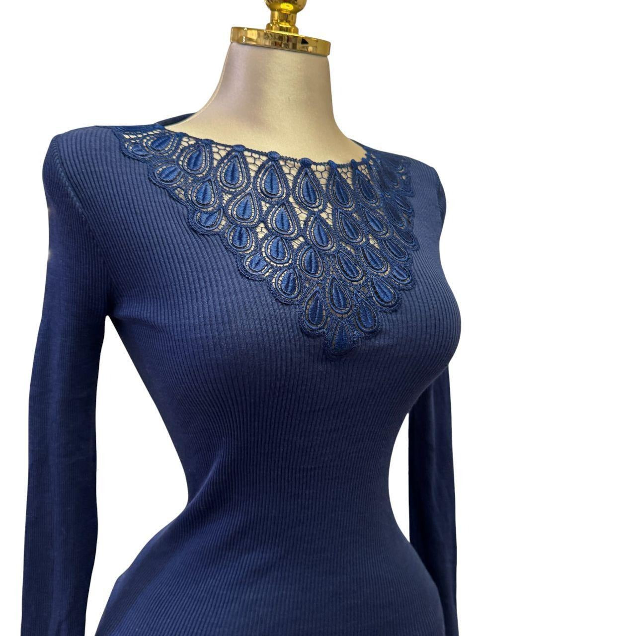 90s Vintage Blue Knit Pattern Neck Top