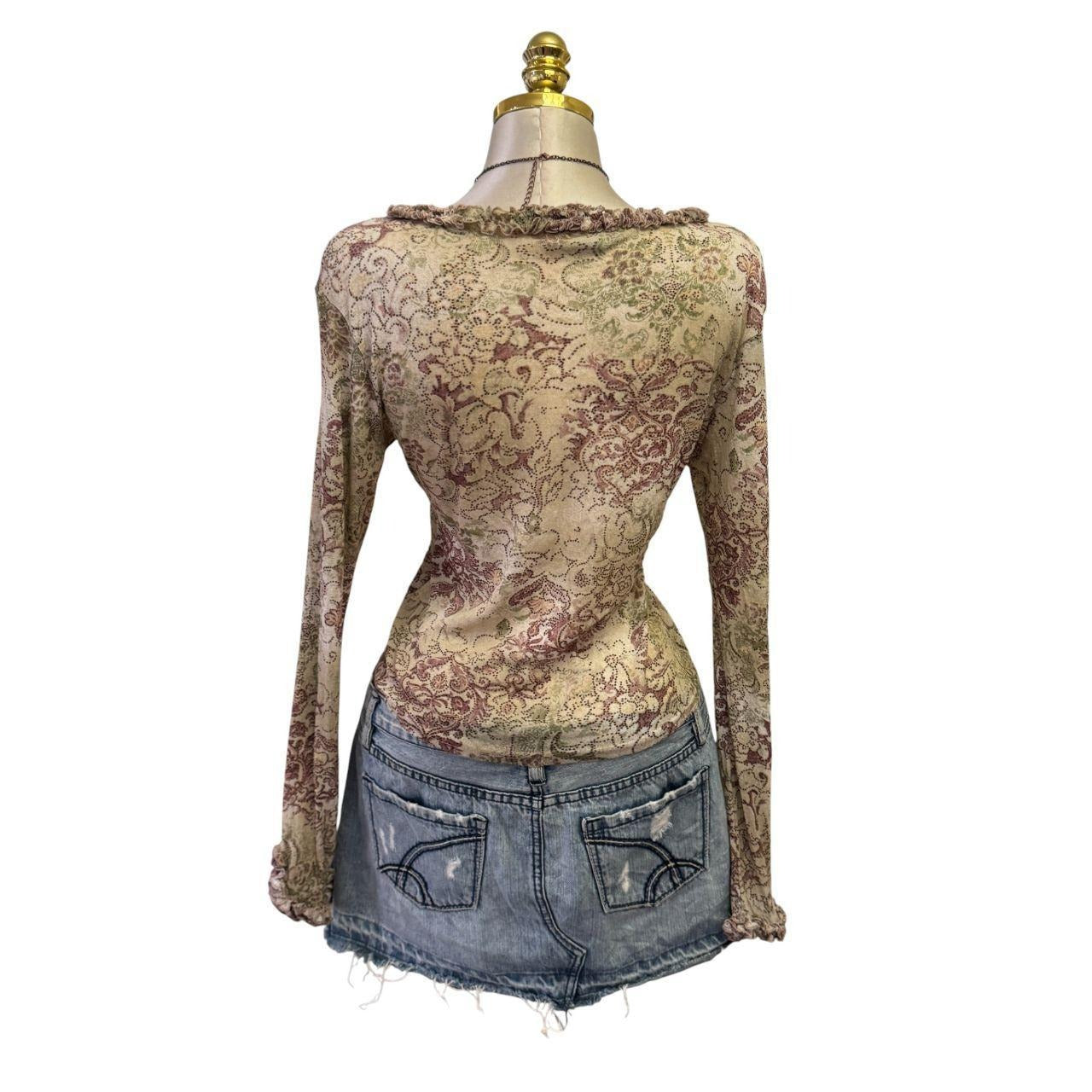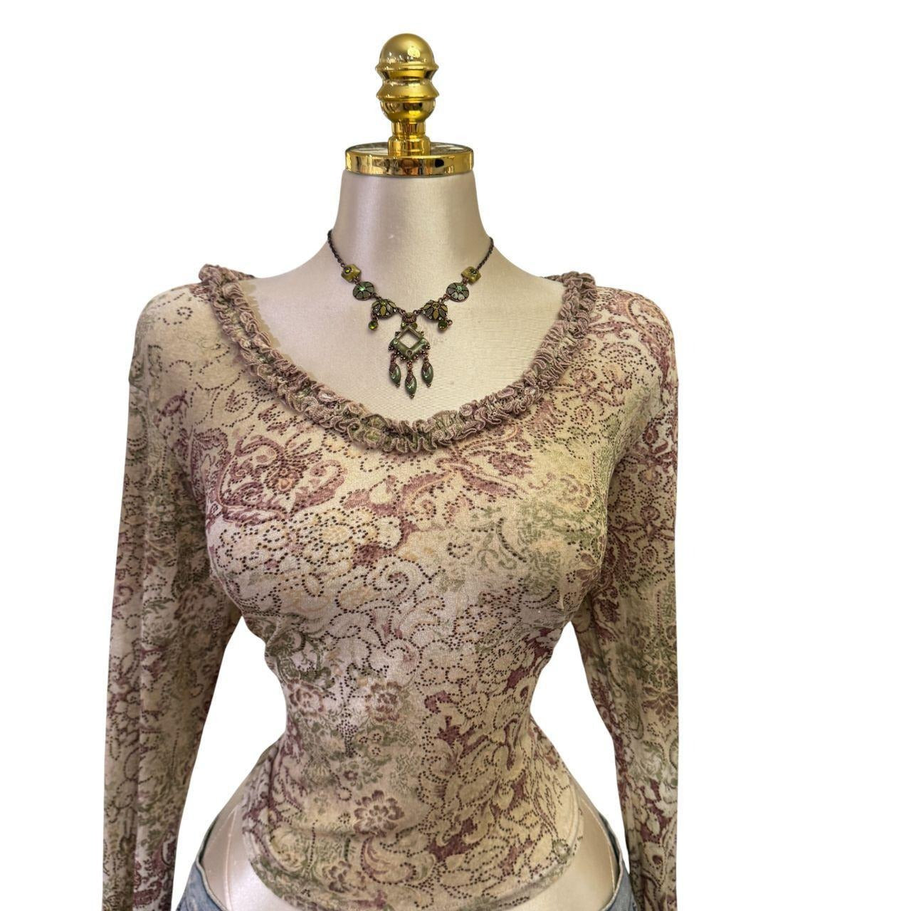 90s Vintage Gray Lavender Mesh Long Sleeve Ruffle Trim Top