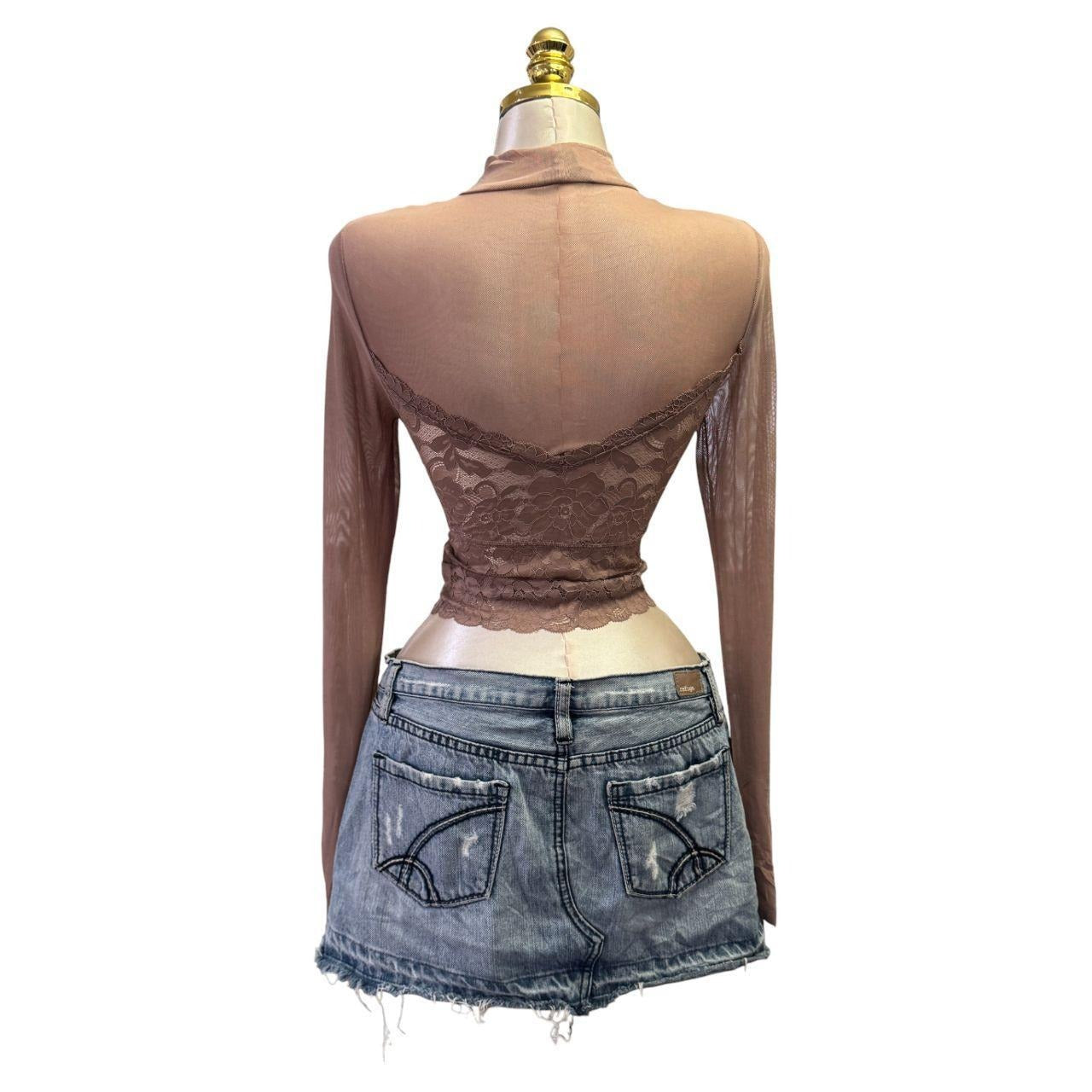 Y2K Vintage Beige Nude Mesh Lace Long Sleeve Top