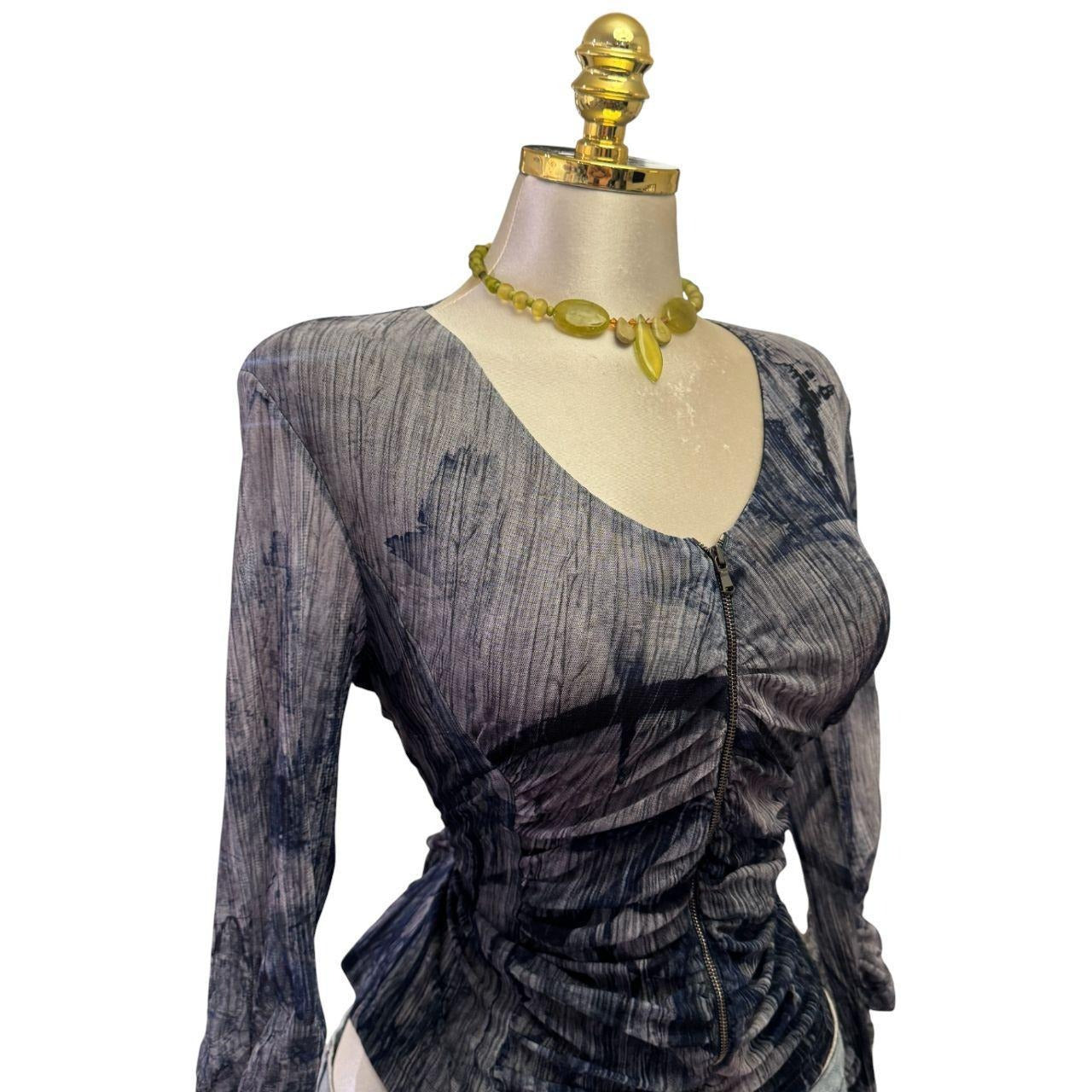 90s Vintage Blue Gray Artsy Zipper Front Ruched Sleeve Top