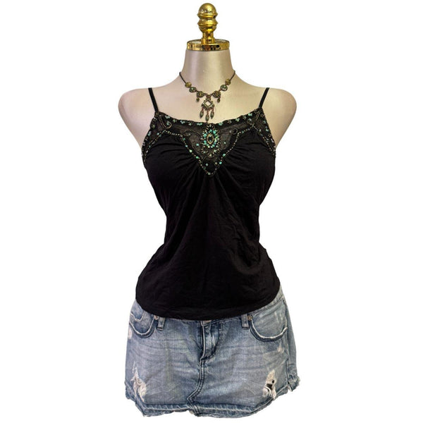 [B#22-5][OCT25]90s Vintage Black Blue Teal Sequin Tank Top ***imported from the UKFits Size(s): mediumLength: 23 in Bust: 38 inSleeve: inWaist: inExcellent ConditionStretchyAdjustable StrapLiningPinned to fit in back only. This mannequin is small so they all have to be pinned.đź’—INSTAGRAMđź’—@thediamondhanger