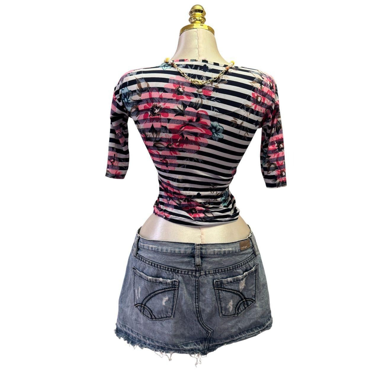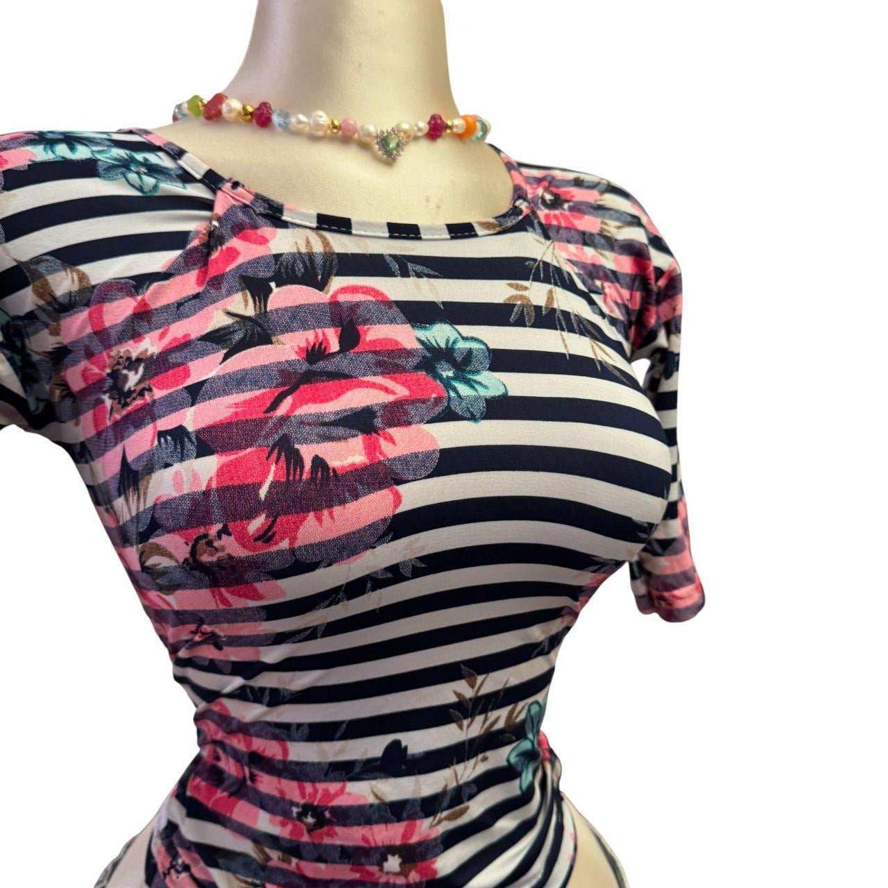 90s Vintage Black White Pink Floral Stripes 3/4 Sleeve Top [XS]