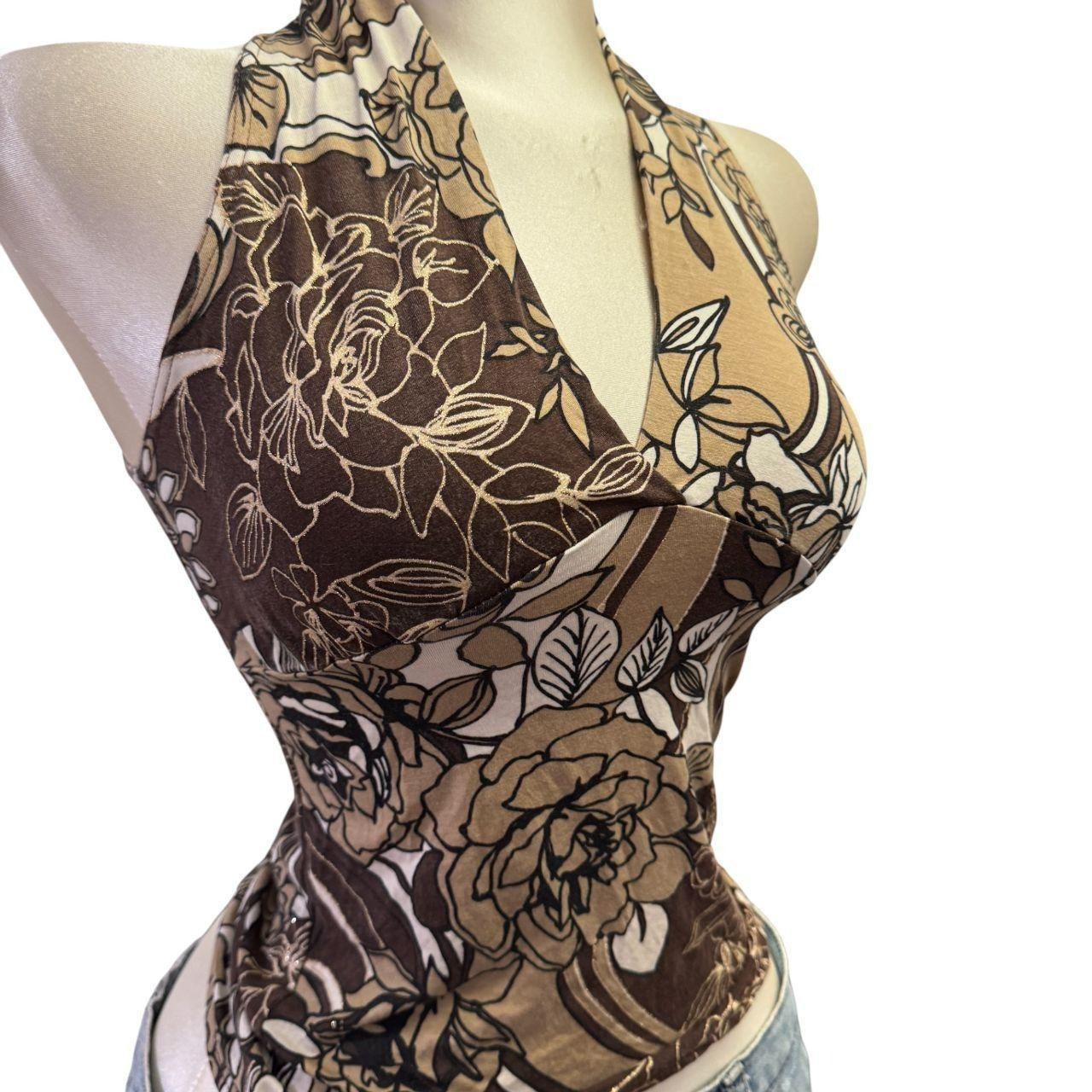 90s Vintage Brown Floral V Neck Glitter Top [XS]