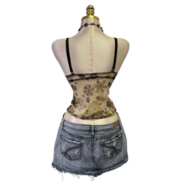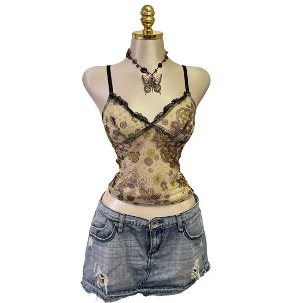 [B#10-18][OCT25]90s Vintage Brown Green Mesh Top Fits Size(s): small Length: 20 in Bust: 30 inSleeve: inWaist: inExcellent ConditionStretchyAdjustable StrapV-NeckPinned to fit in back only. This mannequin is tiny so they all have to be pinned.***imported from the UKđź’—INSTAGRAMđź’—@thediamondhanger