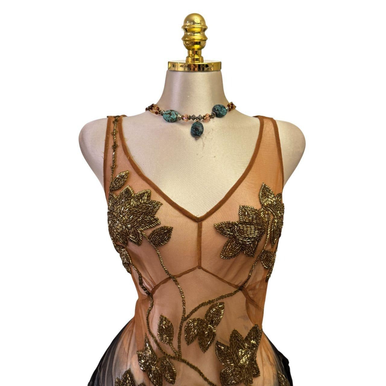 90s Vintage Brown Tie Dye Gold Sequin V-neck Mesh Top
