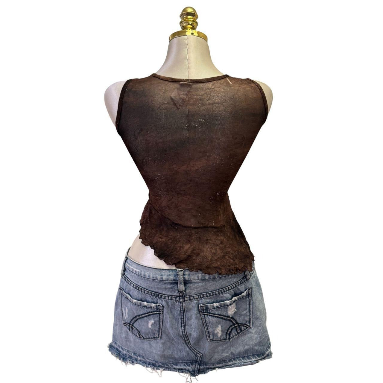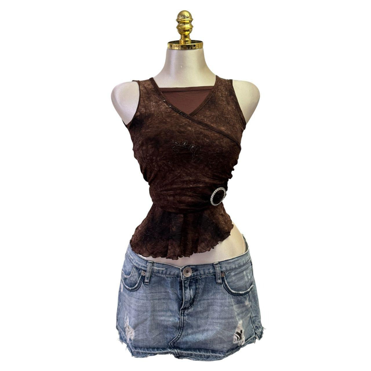 90s Vintage Brown Tie Dye Ruffles Pearl Details Top