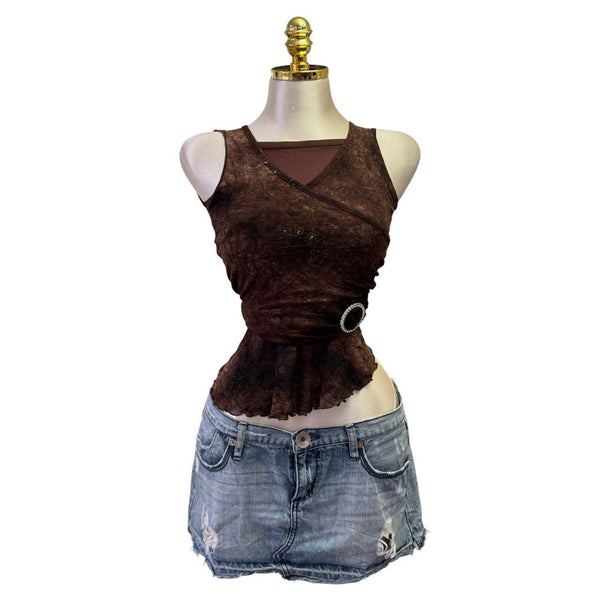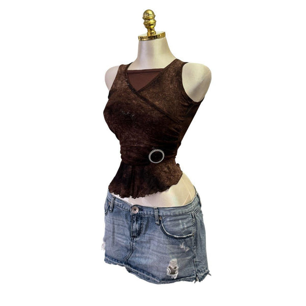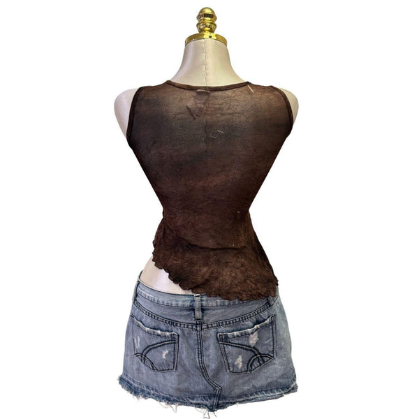 [B#9-4][OCT25]90s Vintage Brown Tie Dye Ruffles Pearl Details Top Fits Size(s): x-small Length: longest 22 in, shortest 18 in Bust: 28 inSleeve: inWaist: inExcellent ConditionStretchySleevelessLiningPinned to fit in back only. This mannequin is tiny so they all have to be...