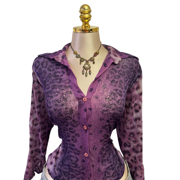 [B#21-20][OCT25]90s Vintage Purple Leopard Tie Dye Top ***imported from the UKFits Size(s): largeLength: 20 in Bust: 40 inSleeve: 20 inWaist: inExcellent ConditionStretchyButton FrontPinned to fit in back only. This mannequin is small so they all have to be pinned.đź’—INSTAGRAMđź’—@thediamondhanger
