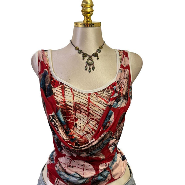 [B#22-6][OCT25]90s Vintage Red Blue Cowl Neck Artsy Top ***imported from the UKFits Size(s): mediumLength: 22 in Bust: 38 inSleeve: inWaist: inExcellent ConditionStretchyPinned to fit in back only. This mannequin is small so they all have to be pinned.đź’—INSTAGRAMđź’—@thediamondhanger