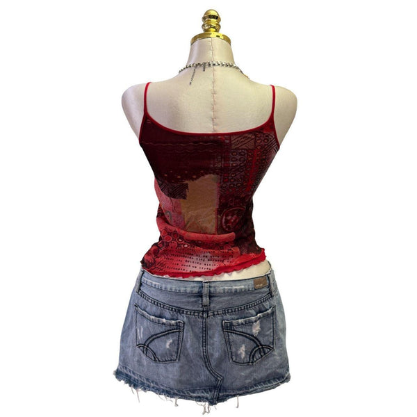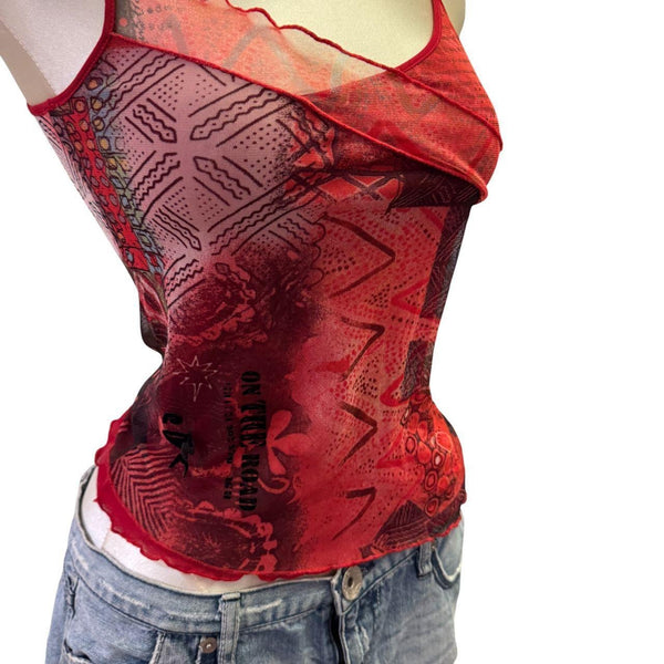 [B#8-13][OCT25]90s Vintage Red Pattern Mesh Top Fits Size(s): x-small Length: 18 in Bust: 26 inSleeve: inWaist: inExcellent ConditionStretchySleevelessV-NeckPinned to fit in back only. This mannequin is tiny so they all have to be pinned.***imported from the UKđź’—INSTAGRAMđź’—@thediamondhanger