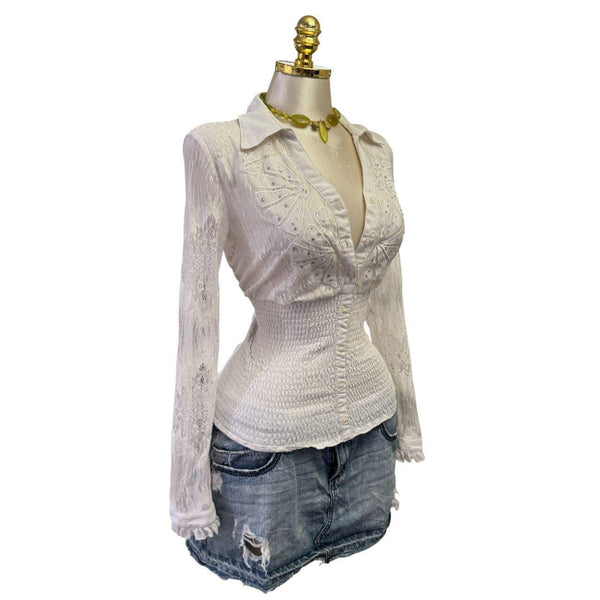 [B#20-7][OCT25]90s Vintage White Lace Sheer Sequin Top ***imported from the UKFits Size(s): large Length: 23 in Bust: 40 inSleeve: 25 inWaist: inExcellent ConditionStretchyLiningButton FrontPinned to fit in back only. This mannequin is small so they all have to be pinned.đź’—INSTAGRAMđź’—@thediamondhanger