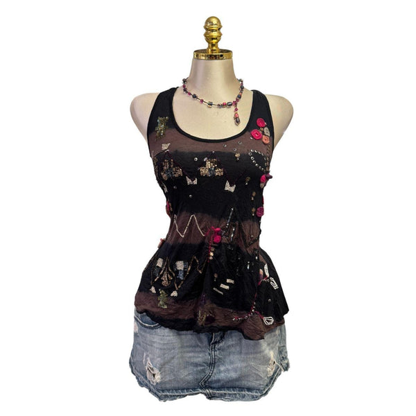[B#12-12][OCT25]Y2K Vintage All Saints Black Brown Beaded Sequin Top ***imported from the UKFits Size(s): medium Length: 28 in Bust: 32 inSleeve: inWaist: inExcellent ConditionStretchy Pinned to fit in back only. This mannequin is small so they all have to be...