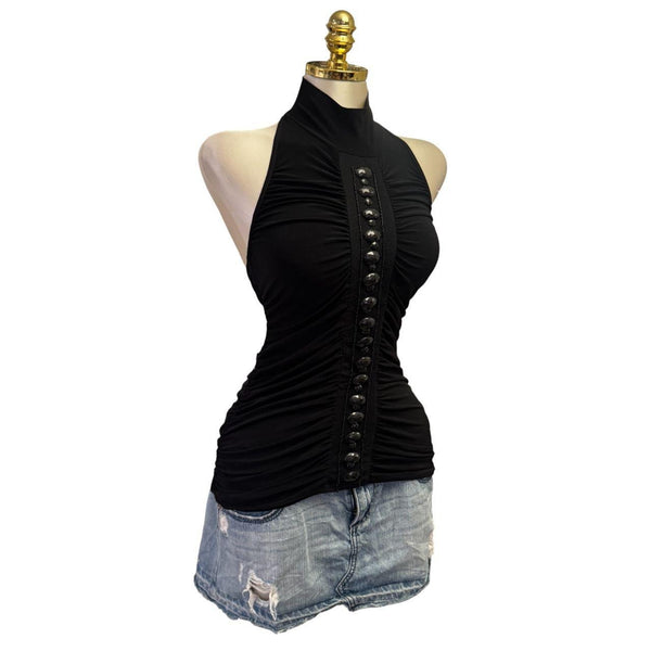 [B#13-18][OCT25]Y2K Vintage Black Beaded Turtleneck Low Back Top ***imported from the UKFits Size(s): medium Length: 24 in Bust: 34 inSleeve: inWaist: inExcellent ConditionStretchy SleevelessBacklessPinned to fit in back only. This mannequin is small so they all have to be pinned.đź’—INSTAGRAMđź’—@thediamondhanger