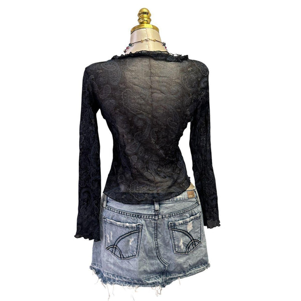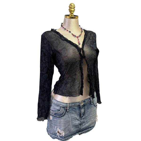 [B#2-11][OCT25]Y2K Vintage Black Blue Paisley Mesh TopFits Size(s): small Length: 20 inBust: 35 inSleeve: 23 inExcellent ConditionStretchyLong Sleeve1/4 ButtonPinned to fit in back only. This mannequin is tiny so they all have to be pinned.***imported from the UKđź’—INSTAGRAMđź’—@thediamondhanger