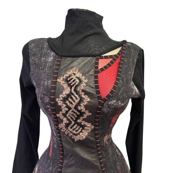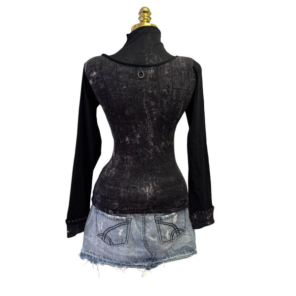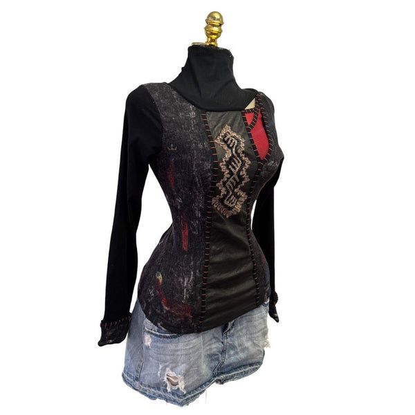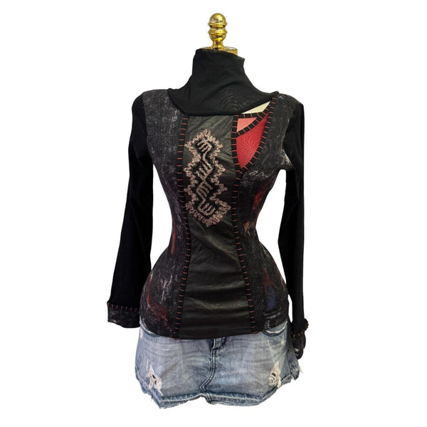 [B#11-14][OCT25]Y2K Vintage Black Faux Leather Embroidered Top ***imported from the UKFits Size(s): x-small Length: 23 in Bust: 28 inSleeve: 26 inWaist: inExcellent ConditionStretchyLong SleevePinned to fit in back only. This mannequin is small so they all have to be pinned.đź’—INSTAGRAMđź’—@thediamondhanger