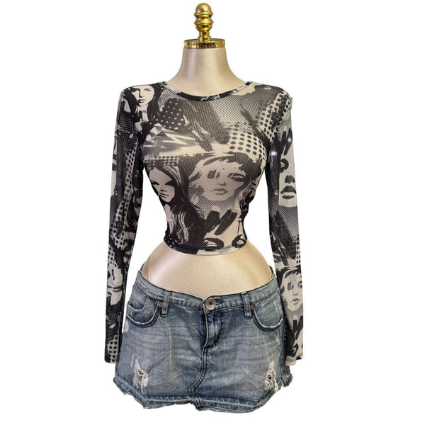 [B#14-18][OCT25]Y2K Vintage Black Gray People Pop Art Mesh Top ***imported from the UKFits Size(s): medium Length: 17 in Bust: 36 inSleeve: 28 inWaist: inExcellent ConditionStretchy Long SleeveCroppedPinned to fit in back only. This mannequin is small so they all have...