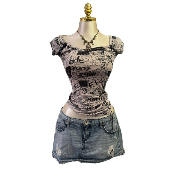 [B#5-12][OCT25]Y2K Vintage Black Light Grey Graphic TopFits Size(s): small Length: shortest 23 in, longest 28 in Bust: 32 inSleeve: inExcellent ConditionStretchyShort SleevePinned to fit in back only. This mannequin is tiny so they all have to be pinned.***imported from the...