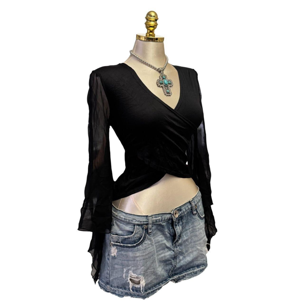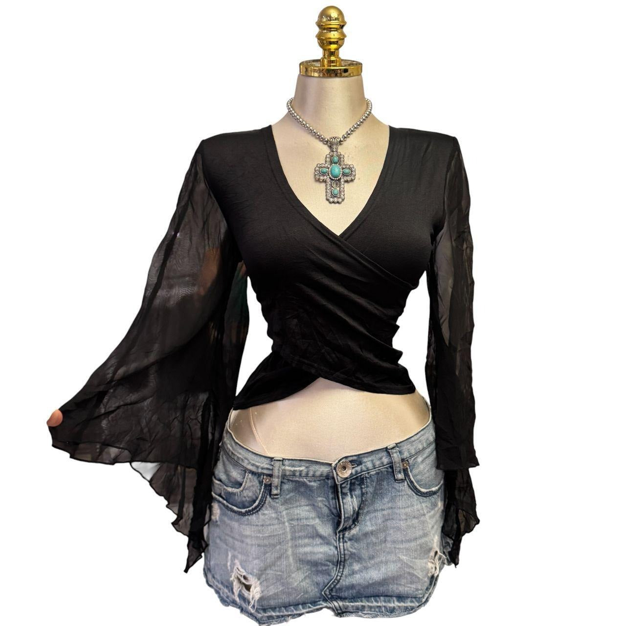 Y2K Vintage Black Mesh Butterfly Sheer Sleeve Top [M]