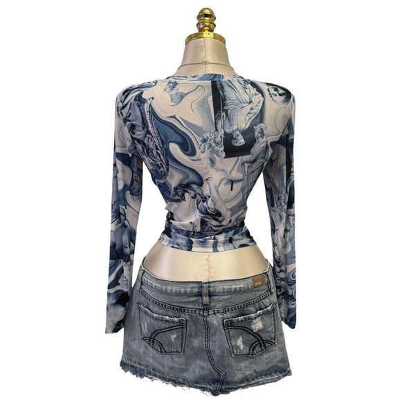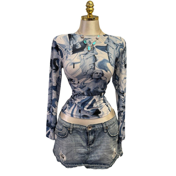 [B#12-14][OCT25]Y2K Vintage Blue Face Print Top ***imported from the UKFits Size(s): medium Length: 21 in Bust: 36 inSleeve: 23 inWaist: inExcellent ConditionStretchy Long SleevePinned to fit in back only. This mannequin is small so they all have to be pinned.đź’—INSTAGRAMđź’—@thediamondhanger