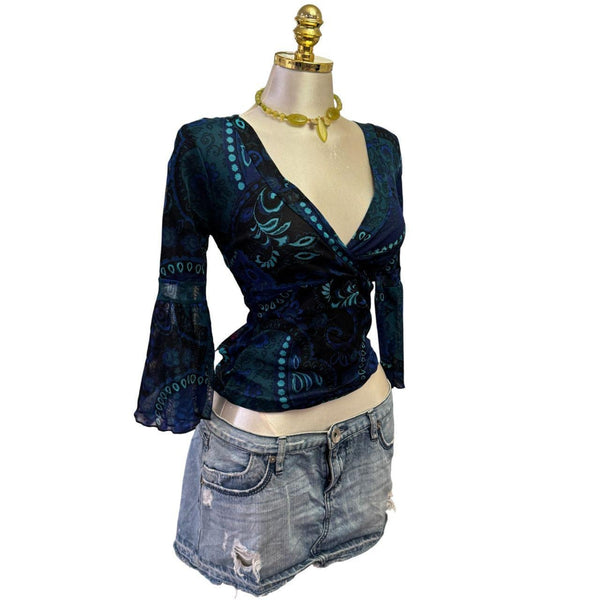 [B#11-15][OCT25]Y2K Vintage Blue Teal Paisley Top ***imported from the UKFits Size(s): medium Length: 20 in Bust: 32 inSleeve: 18 inWaist: inExcellent ConditionStretchyLong SleeveLiningPinned to fit in back only. This mannequin is small so they all have to be pinned.đź’—INSTAGRAMđź’—@thediamondhanger