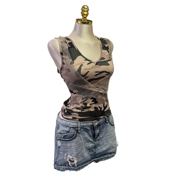 [B#11-7][OCT25]Y2K Vintage Brown Green Camo Net Top ***imported from the UKFits Size(s): medium Length: 20 in Bust: 32 inSleeve: inWaist: inExcellent ConditionStretchyAdjustable StrapPinned to fit in back only. This mannequin is small so they all have to be pinned.đź’—INSTAGRAMđź’—@thediamondhanger