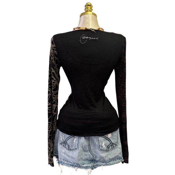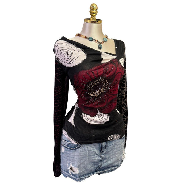 [B#2-2][OCT25]Y2K Vintage Desigual Red Black Beaded Sequin Asymmetrical Neck Top Fits Size(s): small Length: 25 inBust: 36 inSleeve: 30 inExcellent ConditionStretchyAsymmetrical NeckLong SleevePinned to fit in back only. This mannequin is tiny so they all have to be pinned.***imported from...