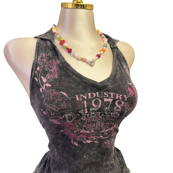 [B#3-9][OCT25]Y2K Vintage Diesel Grey Pink Graphic Tank Top Fits Size(s): smallLength: 20 inBust: 27 inSleeve: inExcellent ConditionStretchyV-NeckSleevelessPinned to fit in back only. This mannequin is tiny so they all have to be pinned.***imported from the UKđź’—INSTAGRAMđź’—@thediamondhanger