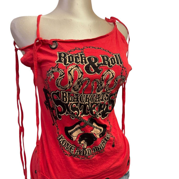 [B#12-18][OCT25]Y2K Vintage Rock And Roll Red W Eyelets Top ***imported from the UKFits Size(s): medium Length: shortest 19 in, longest 27 in Bust: 32 inSleeve: inWaist: inExcellent ConditionStretchy SleevelessPinned to fit in back only. This mannequin is small so they...
