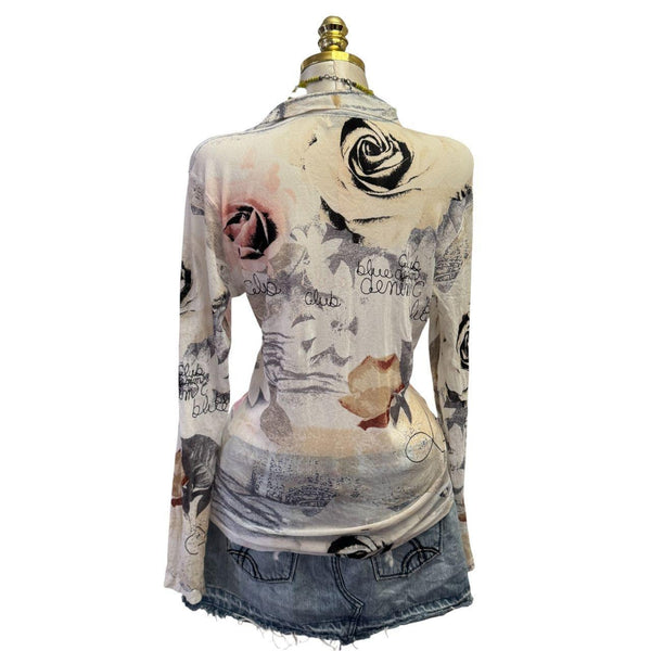 [B#13-12][OCT25]Y2K Vintage White Pink Mesh Artsy "Blue Denim Club" Top ***imported from the UKFits Size(s): largeLength: 23 in Bust: 44 inSleeve: 24 inWaist: inExcellent ConditionStretchy Button FrontPinned to fit in back only. This mannequin is small so they all have...