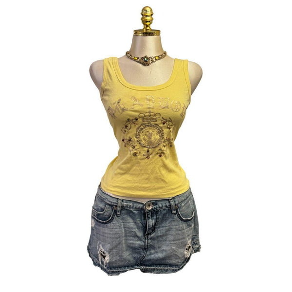 [B#12-17][OCT25]Y2K Vintage Yellow Gold Playboy Gold Sequin Top ***imported from the UKFits Size(s): medium Length: 21 in Bust: 32 inSleeve: inWaist: inExcellent ConditionStretchy SleevelessPinned to fit in back only. This mannequin is small so they all have to be pinned.đź’—INSTAGRAMđź’—@thediamondhanger